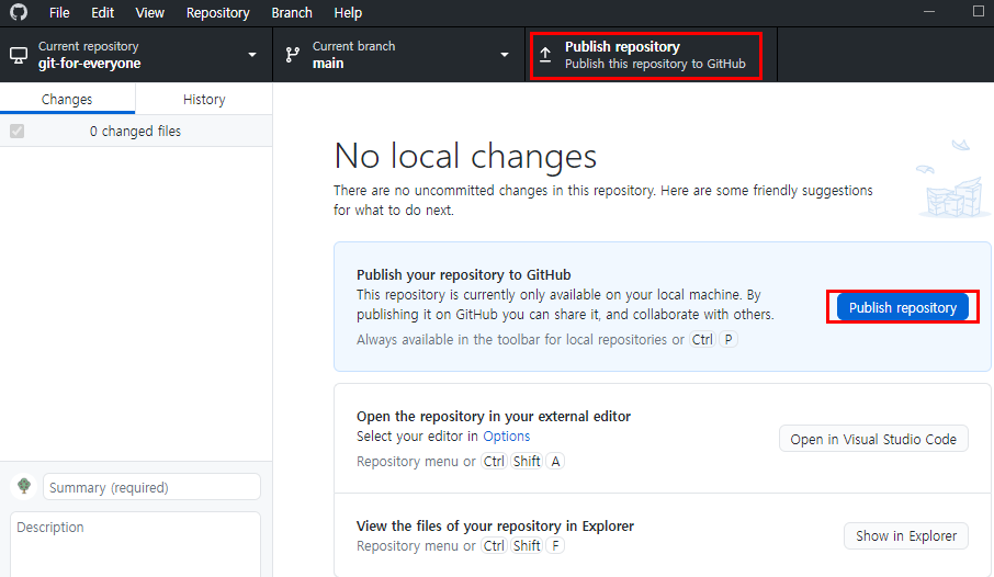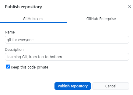 Publish repository를 누른다. 본인의 Github에 Git 프로젝트 폴더를 보낸다.