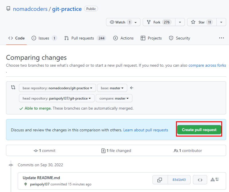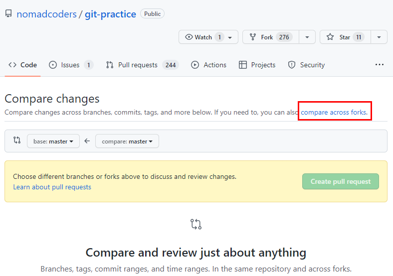branch 간 비교가 아닌, fork 된 저장소와 비교하는 기능 사용.