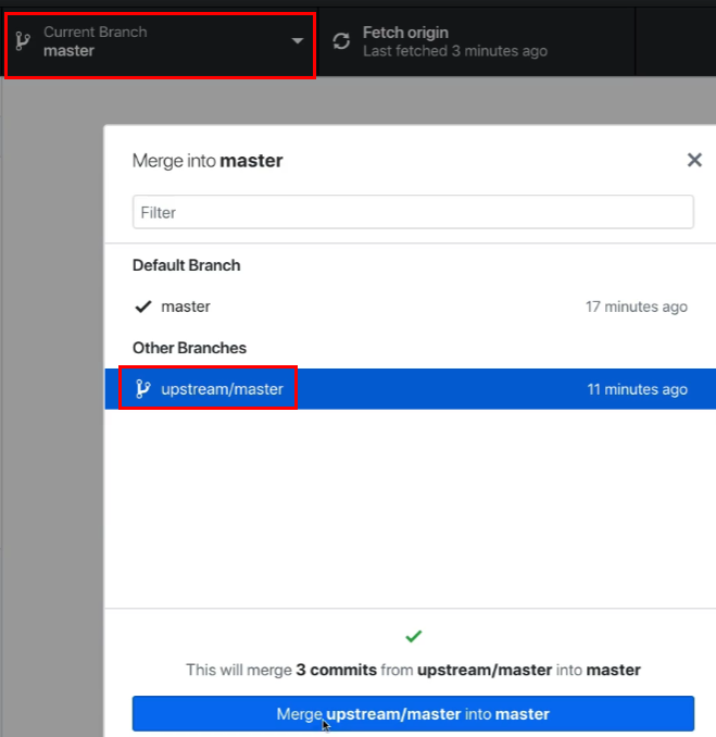upstream/master (원본) 저장소에서 수정사항이 생겼을 경우, upstrea/master branch를 현재 fork한 branch로 merge 시킨다.