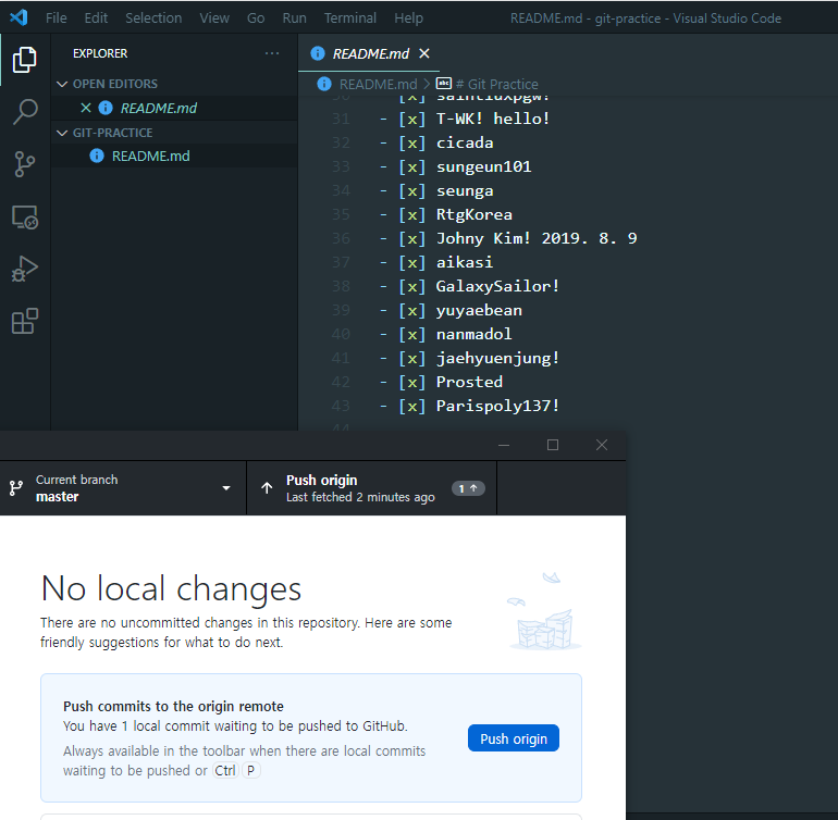 이후의 파일 변경사항은 'Push origin'으로, commit 내역이 있으면 활성화된다.