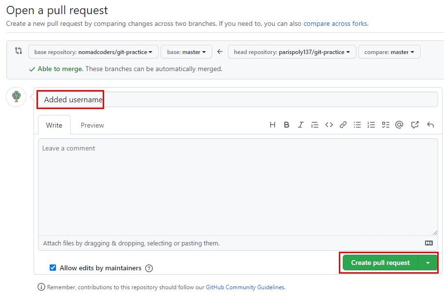 더 아래에 있는 Close pull request 버튼으로 요청을 무시할 수도 있다.