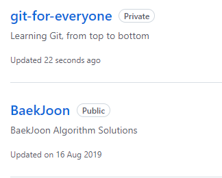 Kepp this code private 체크박스를 체크하면, 위 사진처럼 Repository가 Private으로, 나만 볼 수 있는 상태로 publish된다.